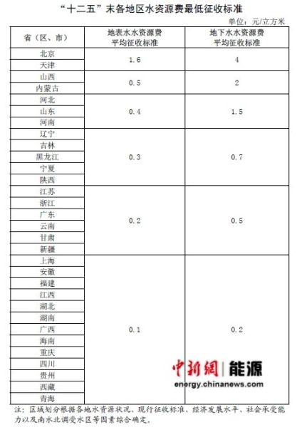 根据《通知》规定的“十二五”末各地区水资源费最低征收标准,北京和天津的地表水水资源管理费平均征收标准为1.6元/立方米,地下水水资源费平均征收标准为4元/立方米,而上海和青海、西藏等省份同列最低费用征收标准范畴,地表水和地下水水资源费平均征收标准分别为0.1元/立方米和0.2元/立方米。