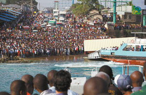 1月26日,蒙巴萨的一辆卡车撞向等待登上渡轮的乘客,造成11人丧生,多人受伤。图为在肯尼亚港口城市蒙巴萨,人们在事故现场围观。