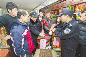 春节临近,涉及烟花爆竹的事故、案件和违法犯罪活动进入高发期,对此滨海新区公安局塘沽分局民警走上街头、深入社区,开展烟花爆竹燃放管理法规政策和安全知识宣传,讲解安全燃放规定,教育引导群众购买合格产品、安全燃放烟花。图为民警在烟花爆竹批发销售店向市民讲解相关安全知识。