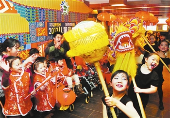 今天上午,2013华夏未来娃娃庙会在华夏未来少儿艺术中心内响锣开市。现场写春联、猜灯谜,制作冰糖葫芦、舞龙表演等充满浓郁中国特色的互动体验项目,令前来参加活动的外来务工人员子女及残疾儿童代表开心不已。 王 津 王 晶摄