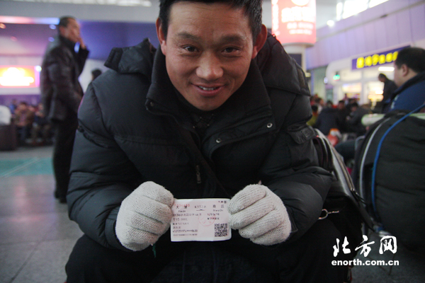 记者在天津站看到河南鹿邑县的赵庆雷,他早就买好了回家的车票,同行的十二三个人一起回家。他从十六七岁就出来打工了,主要在建筑工地做木工,到现在都出来30年了,足迹遍布北京、上海、天津、北京、石家庄等地。