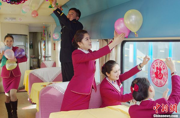 2月7日,几位年轻的列车乘务员正在精心地装点车厢,她们挂起拉花、粘贴福字、装点气球……车厢内一片繁忙。她们所在的北京铁路局北京客运段Z9次列车将要在除夕夜出发,于大年初一的上午十一点到达终点宁波东,这意味着乘坐此次列车的旅客将要在车上度过春节。目前,这趟列车除列车长外,其余乘务员均是年轻的“90后”女孩,她们表示,虽然春节期间无法与家人团聚,但能用优质的服务,将旅客平安送达是自己的荣幸和使命,希望通过自己的努力,让旅客在车上也能享受到回家般的感受。