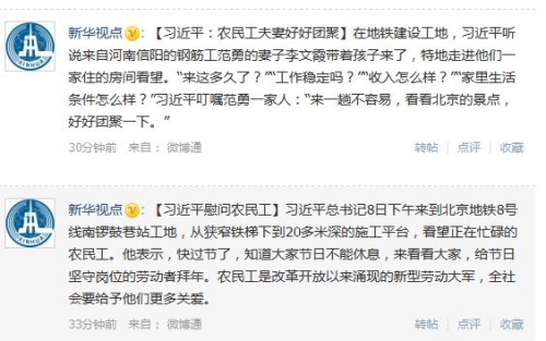 据新华社“新华视点”的官方微博报道,中共中央总书记习近平8日下午来到北京地铁8号线南锣鼓巷站工地,从狭窄铁梯下到20多米深的施工平台,看望正在忙碌的农民工。