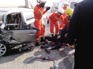 前天14:00左右,一辆解放半挂货车与一辆轿车行驶到滨海新区大港津岐公路马棚口二村附近时,突然相撞。轿车的车头被撞得变形,司机被困在驾驶室内。消防人员赶到后,立即使用破拆工具对小轿车的车门进行破拆,将被困司机营救出来。随后,这名司机被现场的120急救人员送往医院治疗。记者孙瑜徐燕通讯员王磊