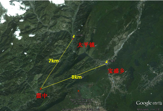 图1宝盛乡、太平镇与地震震中的空间位置关系