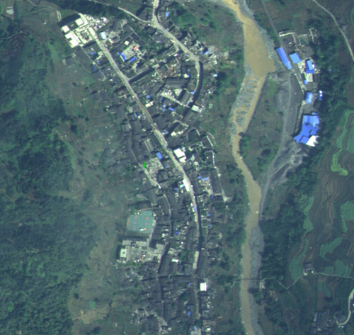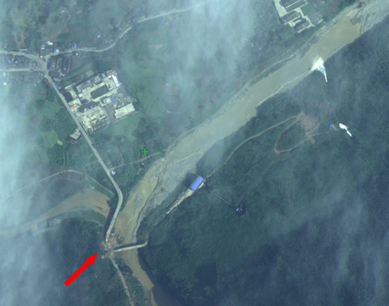 图2宝盛乡高分辨率航空遥感图像,箭头处为山体塌方造成的两条道路堵塞