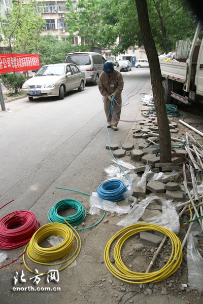 日前,配合全市旧楼区改造工作,本市老旧小区的电力设施改造工程已经全面铺开。在南开区川南里小区记者看到,电力施工人员正在紧张的给各楼门更换新的电力主干线。