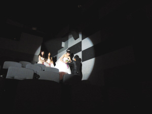 看着稀奇,很多顾客就跟随这对新人来到了一间影厅。此时,200多个座位已是座无虚席,而很多“女影迷”的头上还戴着喜字的头花。更特别的是,大屏幕还滚动播放着新人的照片,记录了他们从相识到相知的点点滴滴。而前排座位与荧幕之间的空地,就成了一个宽敞的舞台。伴随着追光灯,新郎从后排牵手新娘,缓缓走到了舞台上……昏暗的影厅稍加装饰,弥漫着浓浓的浪漫气息。