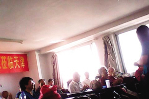 以王老太太孩子的身份,上个周末记者和老人应邀来到了坐落于和平区的康宁大厦。刚刚上楼,就听到从一间屋子里传来歌唱声。进到室内,两名50岁左右的中年妇女就热情迎了上来,并开口问道:“是哪位邀请您来的?”说出邀请人的姓氏,其中一名妇女就说道:“我就是。您先登个记。”记者看到,在门口的一张办公桌旁,另一名中年妇女正在忙着给前来的人登记。而记者听到的歌声,则是先前那些老人和工作人员发出的。轮到王老太太登记,记者看到中年妇女的身前放着一张信息表。这些信息表上详细地标明了姓名、地址、年龄、电话等信息。老人说出名字后,中年妇女就在登记表相对应的后面画上了对勾的同时,还问道:“您老伴没来呀?”