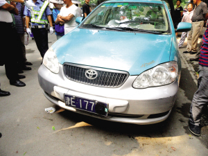 交警赶到,将车号牌报告给指挥中心得知:这辆车疑似是昨日凌晨一起车祸的肇逃车辆。原来,昨日凌晨1时许,在东丽区外环线与卫国道交口处,一辆出租车与一名骑摩托车的男子发生刮蹭,男子受伤,肇事车逃逸。交警通过车子的号牌联系到车主,他很快赶到现场,表示这辆车确实是自己的,但他只是白天跑活儿,晚上由另外一名司机跑活儿,他并不清楚发生了什么事。一位居民说,早上他看到司机匆忙把车开到小区门前便离开了。之后,负责处理肇逃事故的交警将车带回队里调查取证。目前,尚无法确定该车是否是肇逃车,对另一名跑活儿的司机也在调查中。(记者韩爱青文并摄)