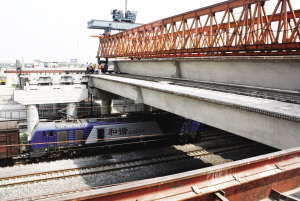 张贵庄铁路立交桥由北向南依次跨越张贵庄火车站的8股站线、运营中的既有津山铁路上下行2股、正在建设中的京津城际铁路延长线2股、津秦客运专线2股,共计14股铁道。同时,津山正线为重要铁路干线,每天车流量为100对,共计200辆,客货车流量密集,影响施工进度。为此,北京铁建公司奉行服务地方经济建设,在保证列车正常安全通行的前提下,充分利用列车行驶间隔,优化方案,安全优质高效地完成各项施工。