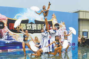 昨日上午9点半,渤海早报记者在航母主题公园广场看到,航母旋梯口左侧摆满了俄罗斯特色食品、纪念品及艺术品,而风情表演区域已被游客围得水泄不通。演员们表演了俄罗斯乡村舞蹈,演唱了《喀秋莎》、《莫斯科郊外的晚上》等人们耳熟能详的歌曲,还即兴邀请围观游客跳起了圆圈舞。