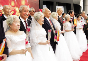 10月10日10点,19对老人在河西区挂甲寺街庆祝金婚,送玫瑰,喝交杯酒。