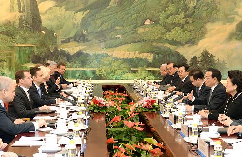 梅德韦杰夫表示,今天我同李克强总理进行了深入会谈,就推进俄中关系、拓展互利合作达成新的重要共识。俄方优先重视对华关系,愿同中方保持密切战略沟通与协调,进一步扩大经贸、能源、科技、人文、农业、基础设施等领域合作,提升合作的规模和水平,更好造福两国人民。