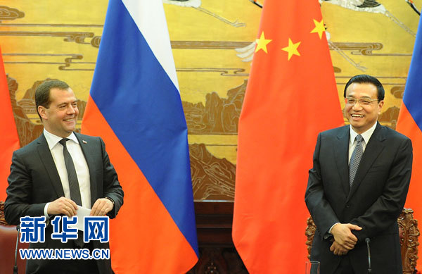 李克强介绍了中俄总理第十八次会晤达成的共识和成果。他说,中俄之间的合作是两个最大邻国之间的合作,是两个安理会常任理事国之间的合作,是两个主要新兴市场国家之间的合作,对两国、欧亚大陆乃至世界的意义都不言而喻。中方愿与俄方携手努力,挖掘潜力,创新方式,推动两国战略合作取得更多新成果。李克强赞赏中俄不久前为抗击黑龙江流域洪涝灾害开展的紧密合作和相互帮助,认为这充分体现了两国的战略合作和深厚友谊。
