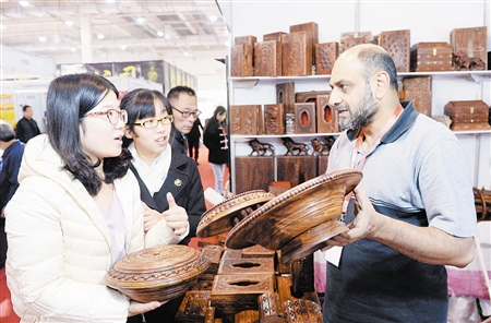 今天上午,2013天津国际礼品工艺品及家居用品博览会在国展中心开幕,吸引了来自26个国家和地区近4万商家到会参展交流。图为精美的巴基斯坦手工艺品吸引了消费者的目光。本报记者王 津摄