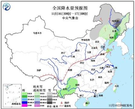 未来三天具体预报方面,16日08时至17日08时,内蒙古中东部、东北地区大部等地有小到中雪(雨)或雨夹雪,其中黑龙江中部、吉林中东部等地的部分地区有大雪,局地暴雪;山东半岛、贵州西部、云南东部和南部、海南东部、台湾东部等地有小雨或阵雨。内蒙古中东部、华北、东北地区大部、黄淮等地有4~6级风。渤海、渤海海峡、黄海北部和中部有7~8级、阵风9级的西北风。