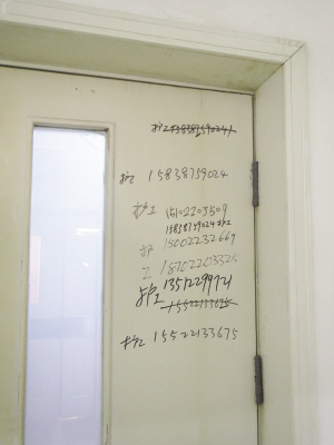 在开水房里面还有一间小屋,小屋的墙上有一块一平米左右的红色铁板,铁板上写着四五十条电话号码。“可能外面没地方写了吧,都写屋里来了,也不怕被电着。”刘女士说。
