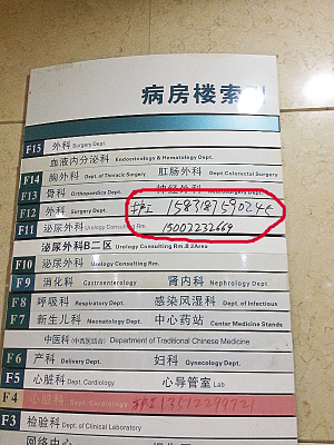 记者在4楼走廊一块1米多高的索引牌上发现,在11楼泌尿外科名称后面的空白处用黑色笔手写着一个“150xxxxx669”的电话号码,在12楼外科科室名称后面的空白处同样用黑色笔写着“护工158xxxxx245”的电话号码。