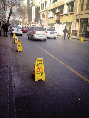 “我们不摆路障,这也得停上车。”一位店铺老板对记者说。一些商铺老板反映,由于周围停车位紧张,道路两边虽然没有划停车线,但也经常有私家车在这里违规停放。记者上午10点左右在现场看到,哈尔滨道、新华路、山东路这些单行路的四条行车道,已经有两条被停放的汽车占据。