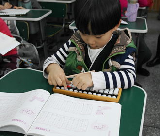 在该校低年级的课堂上,学生们手握算盘,用胖乎乎地小手不停地拨弄着算珠,口中嘟嚷着“一下五去四,三下五去二,一去九进一……”的珠算口诀,很快便算出了数字结果。“珠算常是高位算法,比低年级普通数学的低位算法,更能锻炼孩子逻辑思维。”张永红解释说。