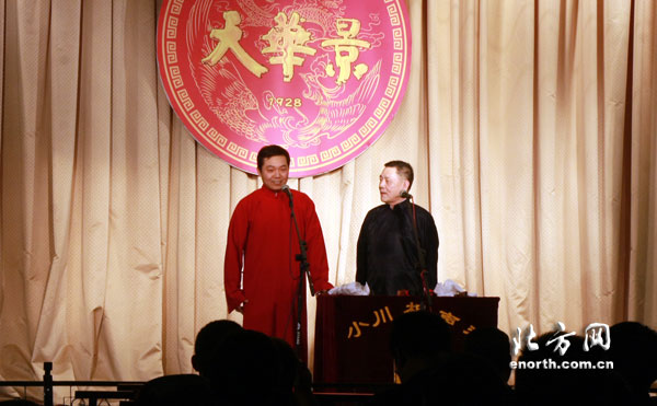 天津北方网讯:日前,由相声泰斗马三立之孙马小川领衔的“小川相声社”在百年老店劝业场天华景戏院进行了首演。马小川首次与相声名家杨进明合作表演了马氏传统名段《相面》,在继承传统的同时,又融入了现代时尚语言,让现场观众忍俊不禁,赢得观众阵阵掌声。