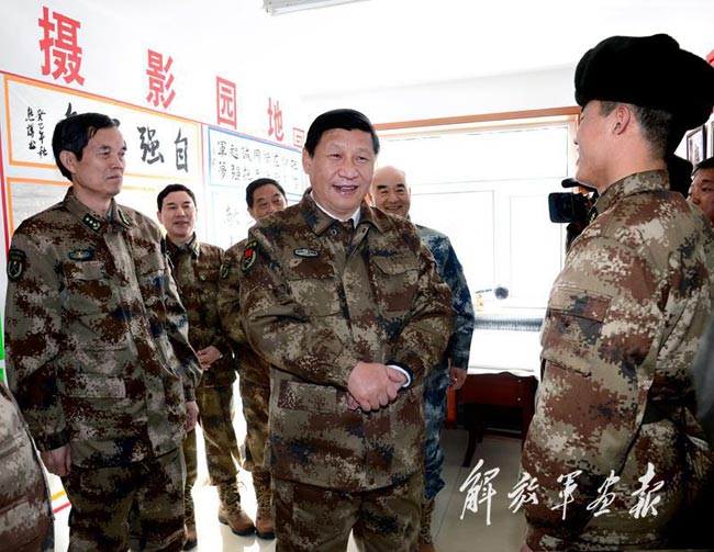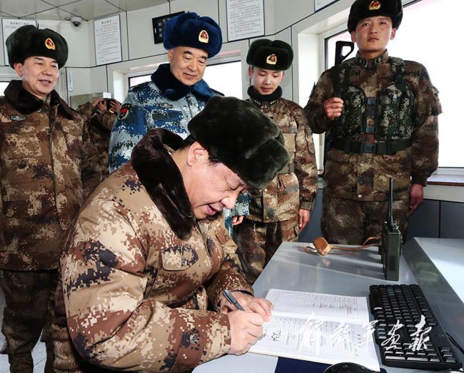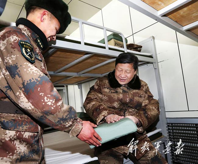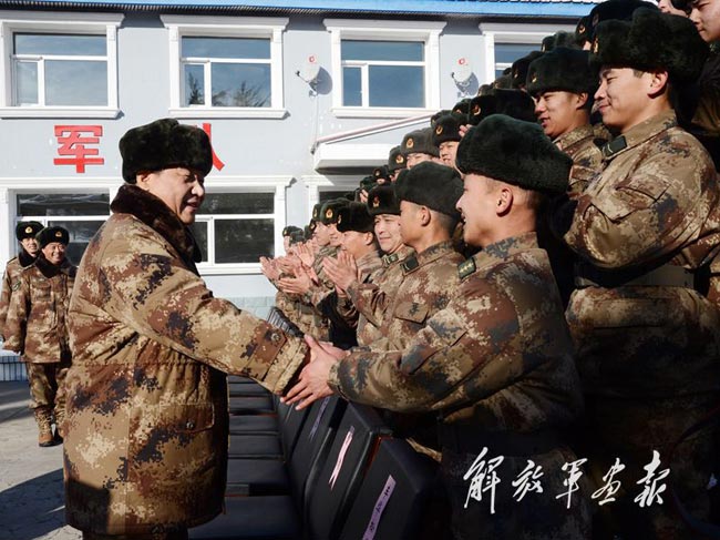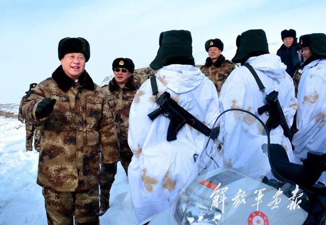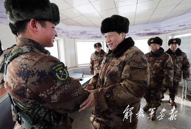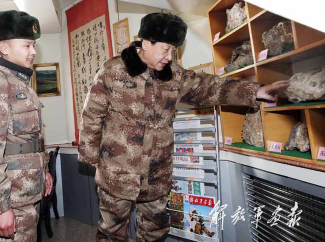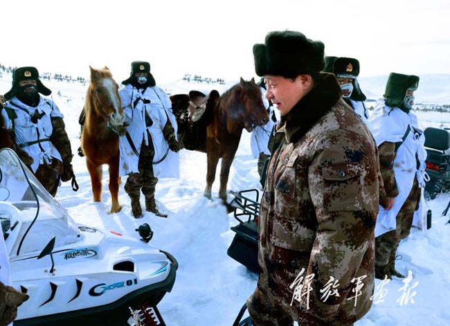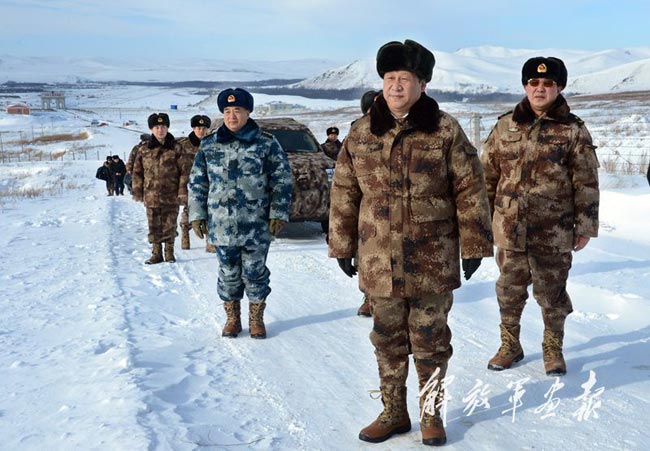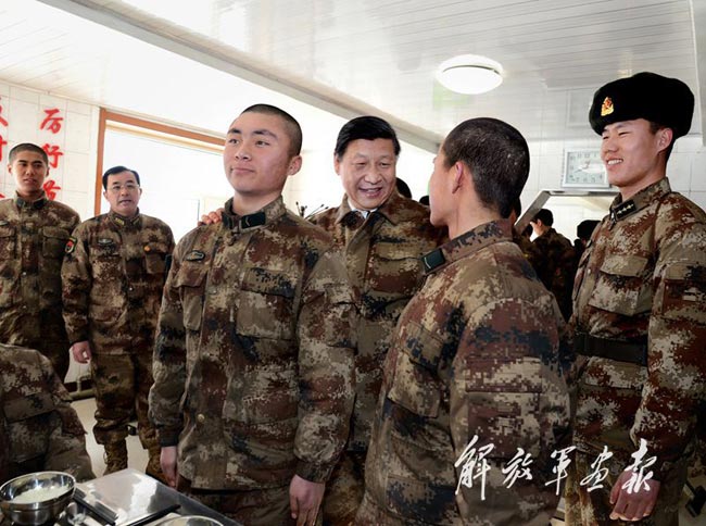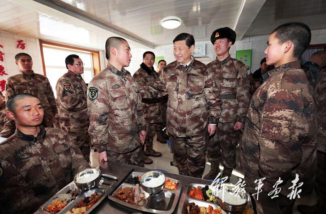1月26日,习近平冒着严寒,前往内蒙古军区边防某部,看望慰问戍边官兵,向在祖国边防坚守战斗岗位的全体指战员致以诚挚问候。习近平前往食堂,同官兵们一样拿起餐盘,在自助餐菜台上打好饭菜,同战士们一同用餐。习近平还到边防线看望一线值勤官兵。