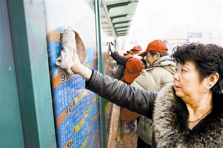 昨天9时许,记者从小白楼公交站顺着600路公交车的线路沿南京路一直走访到丁字沽公交站,沿途每个公交站都有头戴小红帽的老年人擦洗公交站设施。在西北角车站,记者看到几名白发老人提着水桶、喷壶、拿着抹布正在清洁公交站牌。一位大爷用湿抹布将公交站牌上贴着的小广告弄湿,之后用小铲子将小广告铲下,另一名大娘拿着喷壶喷洒清洁液,两位老人配合默契仅用几分钟就擦好了一块一人高的公交站牌。