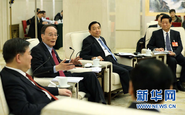 王岐山在陕西代表团参加审议。在听取赵正永、娄勤俭、燕君芳等代表发言后,王岐山表示,完全赞成张德江委员长所作的全国人大常委会工作报告。他强调,要按照习近平总书记在中央纪委三次全会上提出的要求,形成领导干部不想腐、不能腐、不敢腐的有效机制。面对当前依然严峻复杂的反腐败形势,要把遏制腐败蔓延势头作为重要任务,以零容忍态度惩治腐败,形成有力震慑,营造不敢腐的氛围。要全面深化改革,加快体制机制创新,实现国家治理体系和治理能力现代化;推进依法治国,完善党纪党规和法律法规,把制度的篱笆扎得更紧;加强党内监督、群众监督和舆论监督,严肃纪律、强化管理,完善激励约束机制,使之不能腐。最终要靠坚定理想信念,增强宗旨意识,使领导干部不想腐。王岐山希望陕西全面深化改革,实现三秦大地山川秀美、和谐发展。
