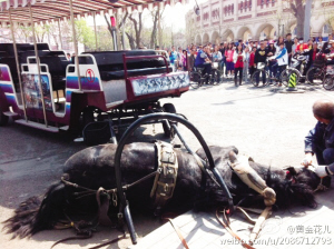 天津北方网讯:清明小长假期间,乘坐五大道上的马车成为不少游客观光的首选。而就在上周日中午,一匹拉车进站的黑马突然摔倒在地,随后被市民拍下上传微博,引发网友对于“马为何摔倒”的种种猜疑。