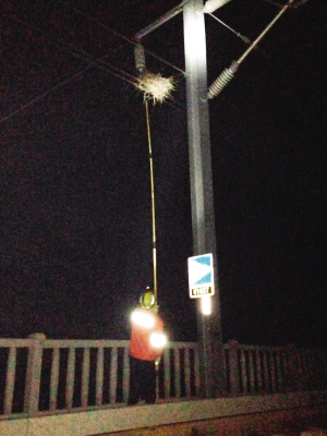 天津北方网讯:春季,鸟儿们开始为自己搭建新家。可在京沪高铁沿线,鸟儿们将窝建在了接触网的电杆上,给列车行驶带来了极大的威胁。记者从京沪高铁天津维管段了解到,在运用各种科技手段的基础上,每天深夜,维管人员巡线通过人工的方式拆除鸟窝,高峰时一夜要拆掉90个。
