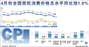 天津北方网讯:昨天国家统计局发布数据显示,4月全国居民消费价格总水平同比上涨1.8%,涨幅创下自2012年10月份以来的新低,这也是一年来CPI首次回到2%以内。对此,国家统计局城市司高级统计师余秋梅认为,4月份的CPI同比涨幅比3月份回落较多,主要因鲜菜和猪肉价格的下跌。