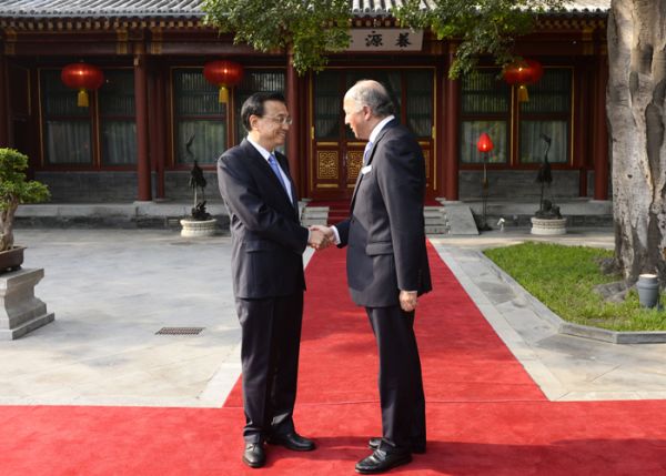 国务院总理李克强19日下午在钓鱼台养源斋会见法国外长法比尤斯。