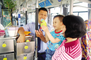 天津北方网讯:市公交二公司872路驾驶员回江涛于日前在无障碍公交车上安装了自制的便民服务箱。服务箱分为4个带锁的小抽屉,里面分别装有儿童玩具、医用急救箱、乘客意见回馈箱、遗失物品保存箱,并在车厢内准备了桶装水和一次性纸杯。回师傅还特意挑选了月季花装饰车厢。