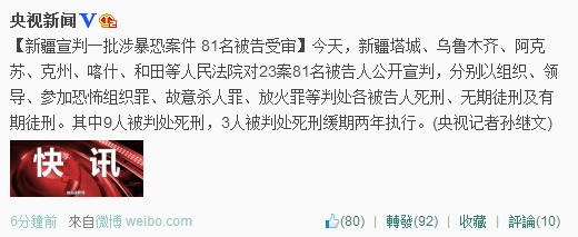 据央视新闻中心官方微博“央视新闻”消息,今天,新疆塔城、乌鲁木齐、阿克苏、克州、喀什、和田等人民法院对23案81名被告人公开宣判,分别以组织、领导、参加恐怖组织罪、故意杀人罪、放火罪等判处各被告人死刑、无期徒刑及有期徒刑。其中9人被判处死刑,3人被判处死刑缓期两年执行。