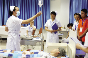 全国职业院校技能大赛在与时俱进地增添了许多关于新兴产业的赛项外,与百姓生活紧密相连的传统领域依旧是考察的重点,看病就医就是其中之一。昨天,2014年全国职业院校技能大赛高职组“护理技能”赛项在天津医学高等专科学校拉开帷幕,来自全国28个省市未来的“白衣天使”们,在这里展开细腻而紧张的角逐。除了传承以往对于“心肺复苏”、“静脉注射”技术的考察,今年竞赛还首次将“头部外伤包扎技术”、“置胃管技术”纳入技能大赛。
