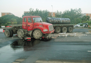 昨天4:00左右,东南半环快速路与富民路交口附近,由河西区往河东区方向车道上,一辆拉带钢的货车横在快速路与辅路之间,车头与车身拧成三角形。10多个水泥隔离墩被撞坏,货车机油发生泄漏。据货车司机介绍,从河北省拉了整车的带钢前往本市,途经事发地附近时躲闪一辆轿车,他打轮过猛,货车先是冲向右侧水泥隔离墩,随后又奔向两条路中间的隔离带,最终冲到对面车道才停下来,其间3卷带钢散落在快速路上。