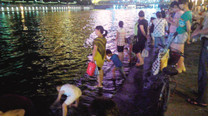 天津北方网讯:大人自备水桶、渔网,坐亲水平台上捞鱼,而孩子也效仿家长河边嬉水。海河边夜晚如此纳凉,看得人胆战心惊。