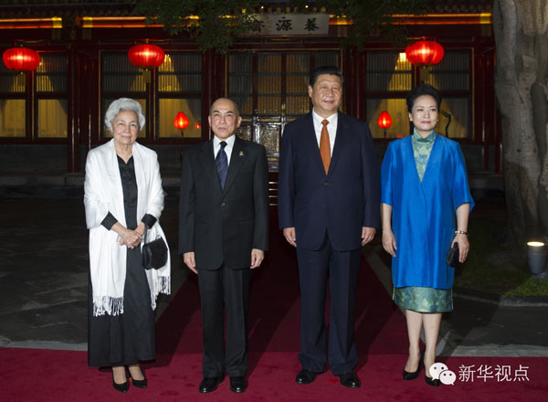 西哈努克太皇去世后,中国领导人和柬埔寨王室继续保持密切交往。今年国庆节前夕的9月25日,习主席夫妇在钓鱼台国宾馆专门会见了柬埔寨国王西哈莫尼和太后莫尼列。习主席充满感情地说,我们这一代人从小就受到中柬友谊的熏陶。西哈莫尼国王和莫尼列太后是中国人民的老朋友、好朋友,我们十分珍视同柬埔寨王室的友谊,一直非常牵挂你们。看到你们身体健康,精神饱满,我感到非常高兴。北京就是你们的家,欢迎你们常回家看看!