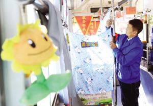 回师傅说,872路途经儿童医院,经常有家长带着很小的孩子乘车看病,可有时孩子饿了,母亲在车上喂奶很尴尬。为此他买了两块长条布,制作了布帘,将一个独立座位围起来,哺乳专座就这样出炉了,这个专座的使用率还是很高的。另外,车内的空气对于乘客来说也很重要,因此,回师傅买了些茉莉花茶,把茶放入红色袋子悬挂在车内,既能吸收车内异味,还能散发出茉莉花香。回师傅表示,一段时间以来,他的这些创意和布置得到了车队领导和同事的支持和赞扬。