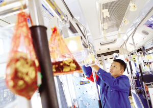 座椅的靠背及上方扶手上都挂着一个红色小袋子,就是婚礼上常见的装喜糖的袋子,里面装着茉莉花茶。这种袋子透气性很好,利于茉莉花香味散发,乘客闻了这淡淡的芳香心情会放松许多。