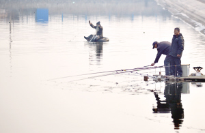 昨日,在本市西青区外环河一片开化的河面上,一名男子乘着自制的“小船”撒网捕鱼,这个“小船”由汽车内胎制成,十分窄小、简陋,男子坐在里面晃晃悠悠,让人捏把汗。