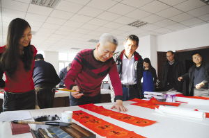 天津北方网讯:“无联不成春,有联春更浓。”随着羊年春节渐渐临近,为增添喜庆祥和的节日气氛,2月10日上午,东蒲洼街道办组织街内的书法爱好者来到亨通花园社区,现场为居民义务写春联,送上羊年“吉祥礼”,构筑了一道传统的年俗文化景观。