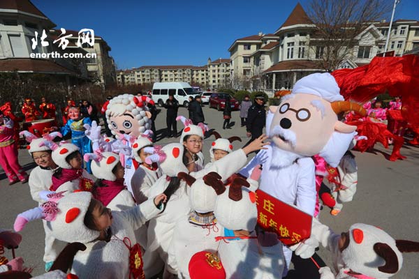 而在小区花园的北侧,一群可爱的“喜羊羊”吸引了不少人驻足观看。这是王兰庄秧歌队特意为这次元宵节展演而精心编排的节目。王兰庄村委会负责人孙美月介绍,秧歌队有90人组成,其中24名小学生扮演“小羊”,其余的均是村委会工作人员和村民扮演的“大羊”。从年前开始,每天都在紧张的排练,还特意从区文化馆请来老师进行指导。