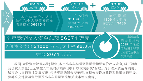 天津北方网讯:备受关注的本市小客车竞价收入资金去向有了结果。昨天,本市发布《天津市小客车总量调控增量指标2014年度竞价收入资金征缴和使用情况公告》。2014年,本市以竞价方式向单位和个人配置普通车增量指标36915个,其中个人指标35109个,平均成交价15254元。全年竞价收入资金总额56071万元。根据规定,竞价收入资金专项用于城市公共交通事业发展支出,2014年,本市小客车增量指标竞价资金支出54000万元。