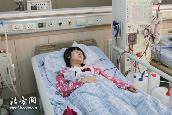 透析室内,王晶躺在病床上正在接受治疗,和上次见到她时一样,她会亲切的叫记者“姐姐”,一个乖巧稚气的女孩子。“每次透析都要躺几个小时,其实挺闷的,希望自己换完肾病可以快些好,可以像其他同龄人一样幸福的生活。”王晶说。