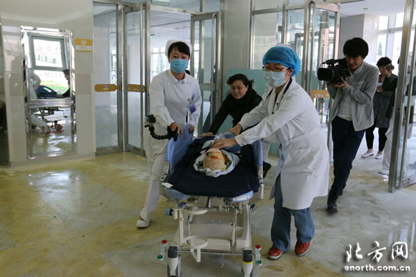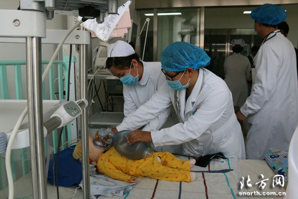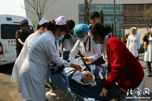 天津北方网讯:4月20日,天津市儿童医院100余名医护人员来到天津市第二儿童医院开展急救演练,为天津市第二儿童医院开诊提前做好准备。演练现场,医护人员就感染科手足口重症、救护车运送病人进急诊抢救室救治、耳鼻喉科急重症等进行演练。(北方网新媒体记者赵首蕊现场报道)