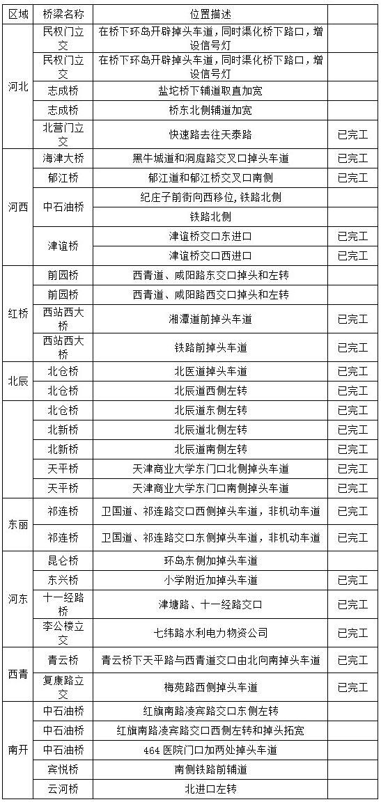 “掉头改造工程位于天津市中心城区内,主要涉及李公楼立交桥、十一经路桥、海津大桥、东兴桥等21座桥梁,共35处点位,范围涵盖8个行政区,工程的主要内容是对桥梁下部道路增加掉头车道或左转专用车道,以缓解桥下道路交通压力。”天津市道桥处生产科副科长马津生向北方网新媒体记者介绍。