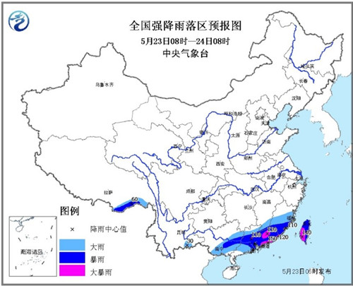 预计,5月23日8时至24日8时,云南东南部、广西中南部、广东大部、江西南部、福建中南部、台湾、西藏东南部等地有大到暴雨,其中,广东中东部和南部沿海、福建东南部沿海、台湾西部等地的局部地区有大暴雨(100~150毫米);上述部分地区小时雨强30~50毫米,局地可达60毫米以上。