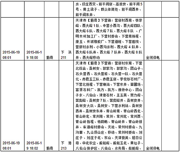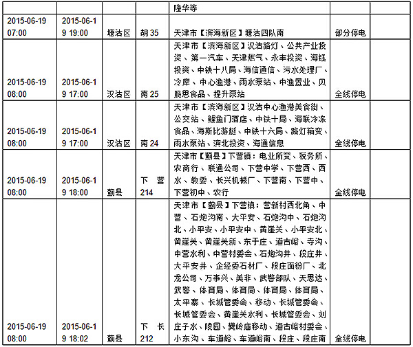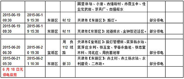 2015年6月15日至6月21日计划检修停电预告